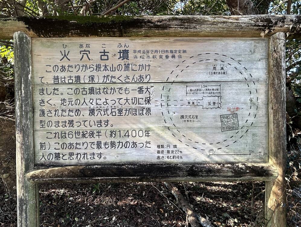根本山の周辺には、1935(昭和10)年の調査では153基の古墳が確認されたというが、現在では22基のみが残されている。しかし、根本山周辺には古墳群を構えるほどの大集落があったとは考えられないため、謎が残る。「火穴」の謂れは石材の色ともいわれるが、定かではない。