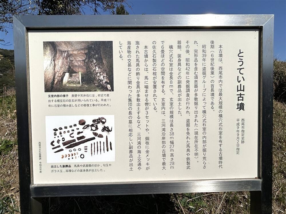 出土遺物は金環,玉類,馬具,須恵器などで、古墳のある丘陵(標高約40m)より三河湾を一望できることから、被葬者は三河湾の海上交通を支配した人物と考えられている。古墳時代後期の6世紀後半の築造とみられる。