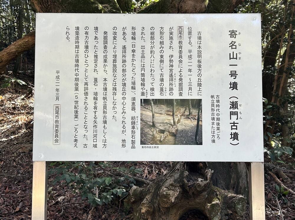 寄名山にある瀬門神社の東南に位置する20m級の帆立貝形古墳もしくは方墳である。伊勢神宮遥拝所跡の部分が墳丘の中心とみられるが、地形の改変により埋葬施設は残存していない。遥拝所跡の方形石組みの東側には、古墳の葺石袖部が8~9mにわたって検出されている。出土品には、円筒埴輪や蓋形埴輪,須恵器,紡錘車形石製品がある。