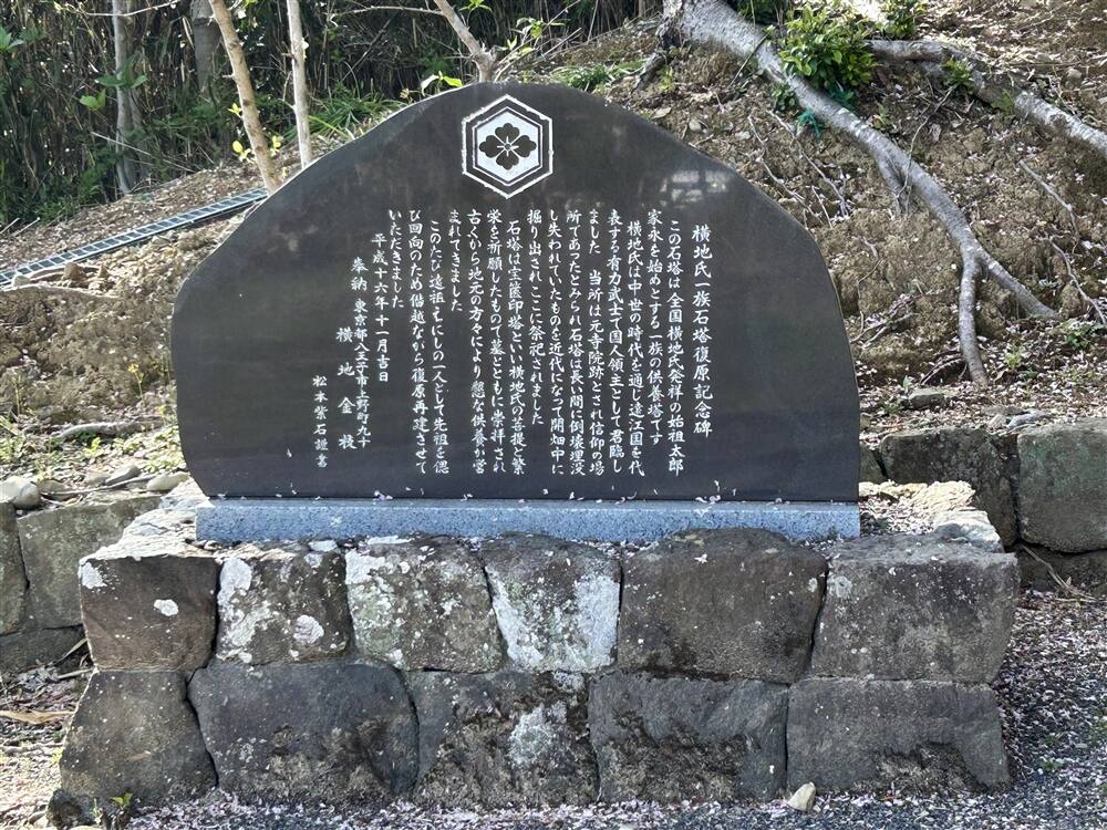 1126(大治元)年に東遠江の横地で亡くなった横地太郎家永の宝篋印塔と伝わる。当地は寺院跡とされ、多くの宝篋印塔や五輪塔が長い間埋没していた。近代になり開畑中に掘り出され、横地氏の子孫によって祭祀されたものである。